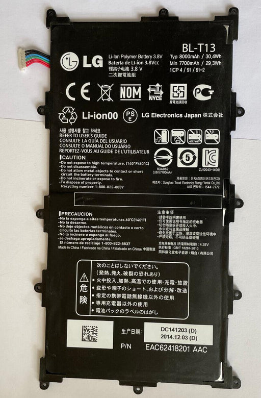 GENUINE BATTERY LG G PAD 10.1 BL-T13Genuine batteryLithium-Ion3.8V /30.4Whr8000mAh TypicalCharge Voltage 4.2V ~ 4.4V